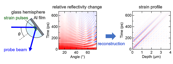 本実験で用いた試料は、直径10 mmのガラス半球であり、平坦面にアルミニウム薄膜を蒸着させた構造です。アルミニウム膜中で赤外レーザーパルスにより生成されたピコ秒音響パルスはガラス中へ伝播し、青色レーザーパルスを用いて検出されます。下図を参照してください。